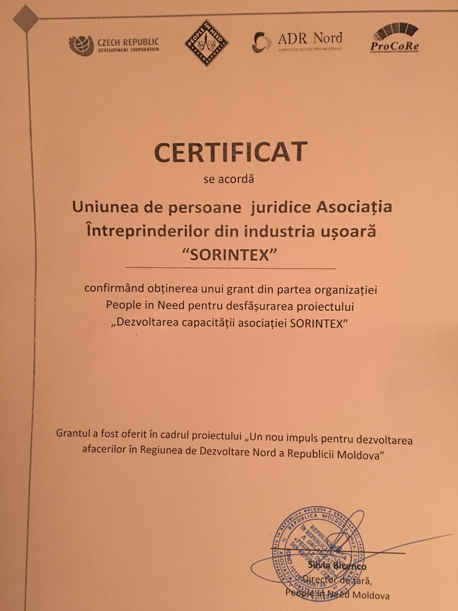 În luna noiembrie 2018, Asociația „Sorintex” a aplicat către Reprezentanța din R. Moldova a Organizației „People in Need” din R. Cehă la proiectul „Dezvoltarea capacității Asociației „Sorintex”, cu un buget de 10000,00 euro, dintre care 5000 euro grant, care au fost obținuți în cadrul concursului de proiect.